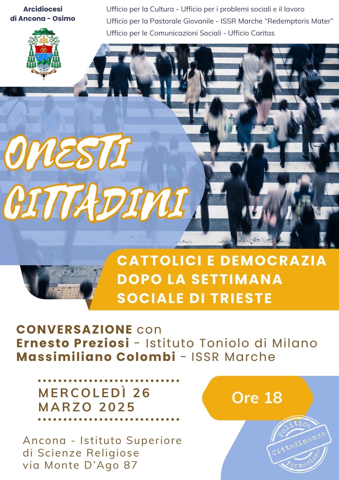 Mercoledì 26 Marzo 2025 – Cattolici e Democrazia dopo la settimana sociale di Trieste, conversazione con Ernesto Preziosi e Massimiliano Colombi.